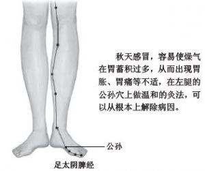 多方思忖之后,我选取了她左脚上的公孙穴进行治疗。公孙穴是足太阴脾经络穴,络于胃,而“脾主升”,左公孙穴必然应脾之升而提气。燥气伤人,其性沉降,当秋季人感冒后,燥气会在胃过多蓄积,就影响脾经络穴公孙气的升提,导致其气蓄积于胃,胃胀、胃痛就出现了。
